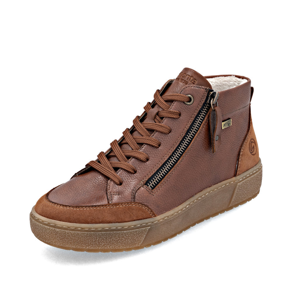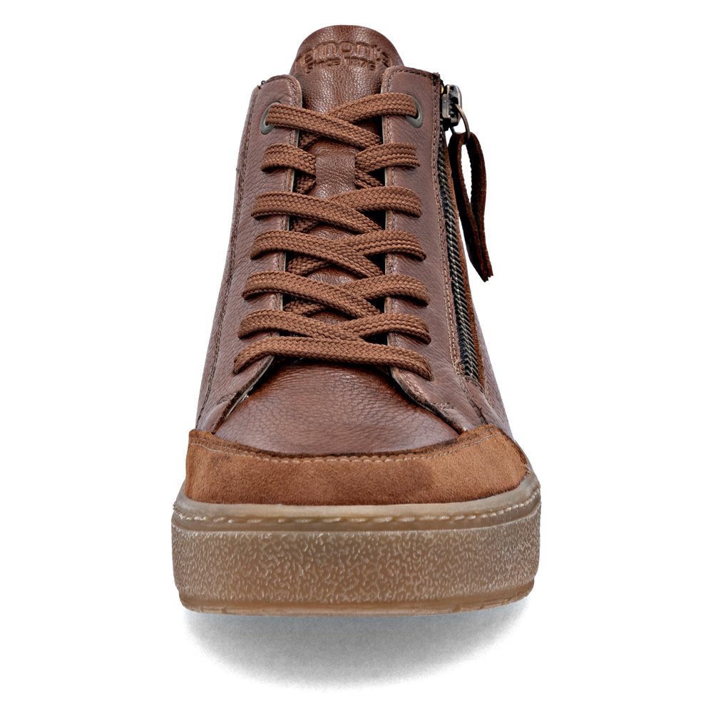Modern design can be comfortable! With these comfortable brown remonte high-top sneakers made of smooth leather impress with a cool look and functional power. The lacing complements the zipper for functionality and comfort. The padded and removable insole and the cushioning and grippy sole are special goodies on top. The model is cut in comfort width. Thanks to the remonteTEX technology, the shoe is water-repellent and offers protection from the wind. A great, comfortable companion for beautiful days!